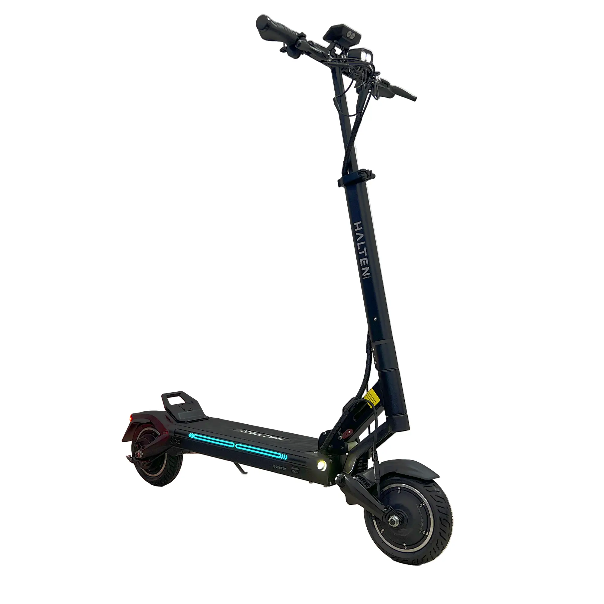 Современный и стильный дизайн Halten Tornado V2 дополнен декоративной подсветкой, что не только придает ему привлекательный вид, но и улучшает видимость в темное время суток. Освещение передней и задней частей самоката обеспечивает безопасность во время поездок в условиях низкой освещенности. Полный привод способствует отличной управляемости и маневренности, что особенно важно в городских условиях.