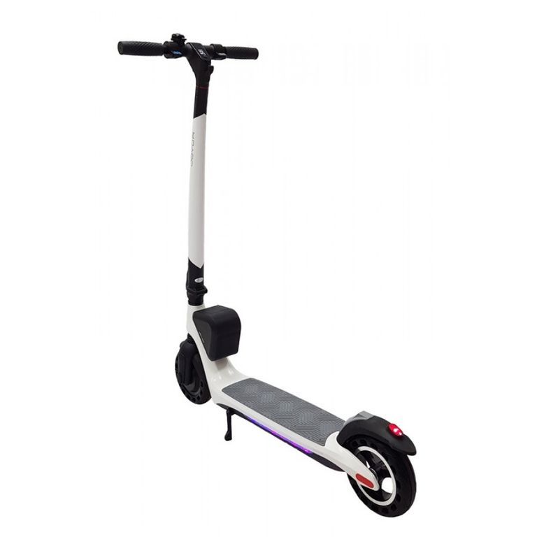 - Для безопасного вождения при плохом освещении самокат снабжен LED фонарем на рулевой стойке, задним стоп-сигналом и регулируемой цветной подсветкой по нижнему краю деки.