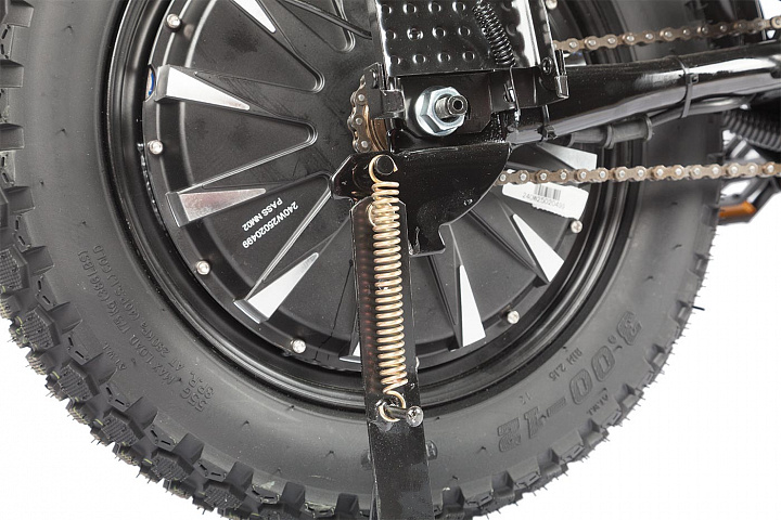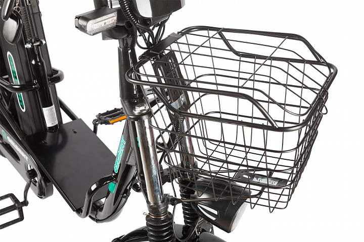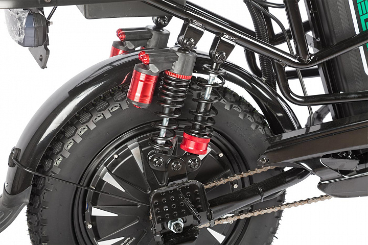 Электровелосипед имеет габариты 1700 х 1150 х 800 мм и выполнен из прочной стальной рамы, что обеспечивает долговечность конструкции. Сухой вес составляет 57 кг, что делает его достаточно устойчивым и удобным для транспортировки.