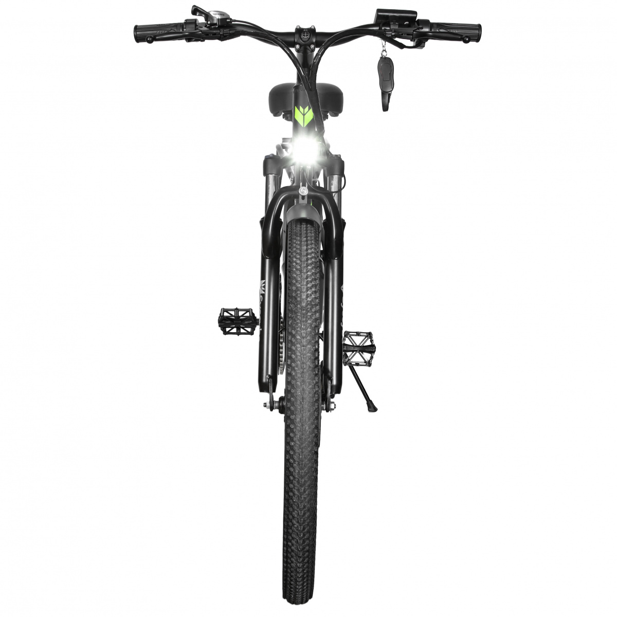 Велосипед оснащен комфортным сиденьем с возможностью регулировки по высоте, что обеспечивает удобство для райдеров любого роста. Передний амортизатор помогает сгладить неровности дороги, делая поездки приятными даже на сложных участках. На руле расположены кнопки управления освещением, звуковым сигналом и ручка газа, упрощающие использование.