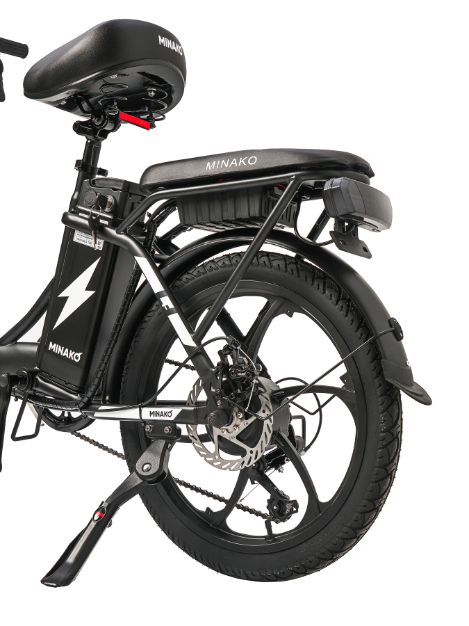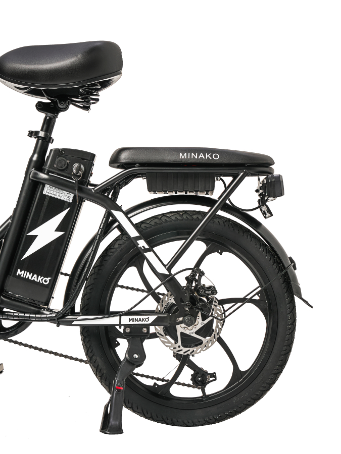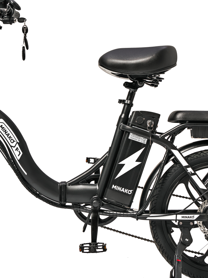 Minako F7 оборудован батареей емкостью 48V 10Ah, что позволяет ему обеспечивать хорошую дальность хода. Зарядное устройство с одним пином делает процесс зарядки простым и быстрым. Максимальная нагрузка в 150 кг позволяет использовать велосипед разными пользователями, включая тех, кто хочет взять с собой дополнительные вещи.