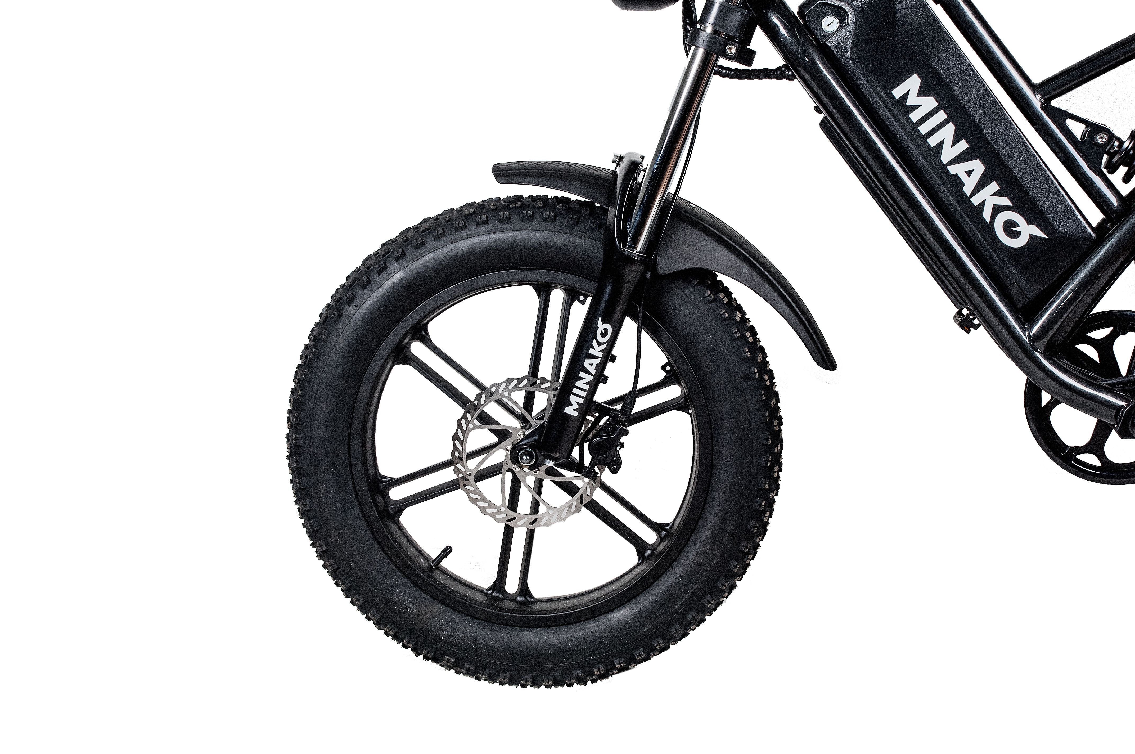 Широкие колеса и качественные шины обеспечивают отличное сцепление и устойчивость на различных покрытиях, что делает Minako FOX универсальным для городских и загородных поездок. Этот электрофэтбайк – отличный выбор для тех, кто ценит стиль, комфорт и производительность